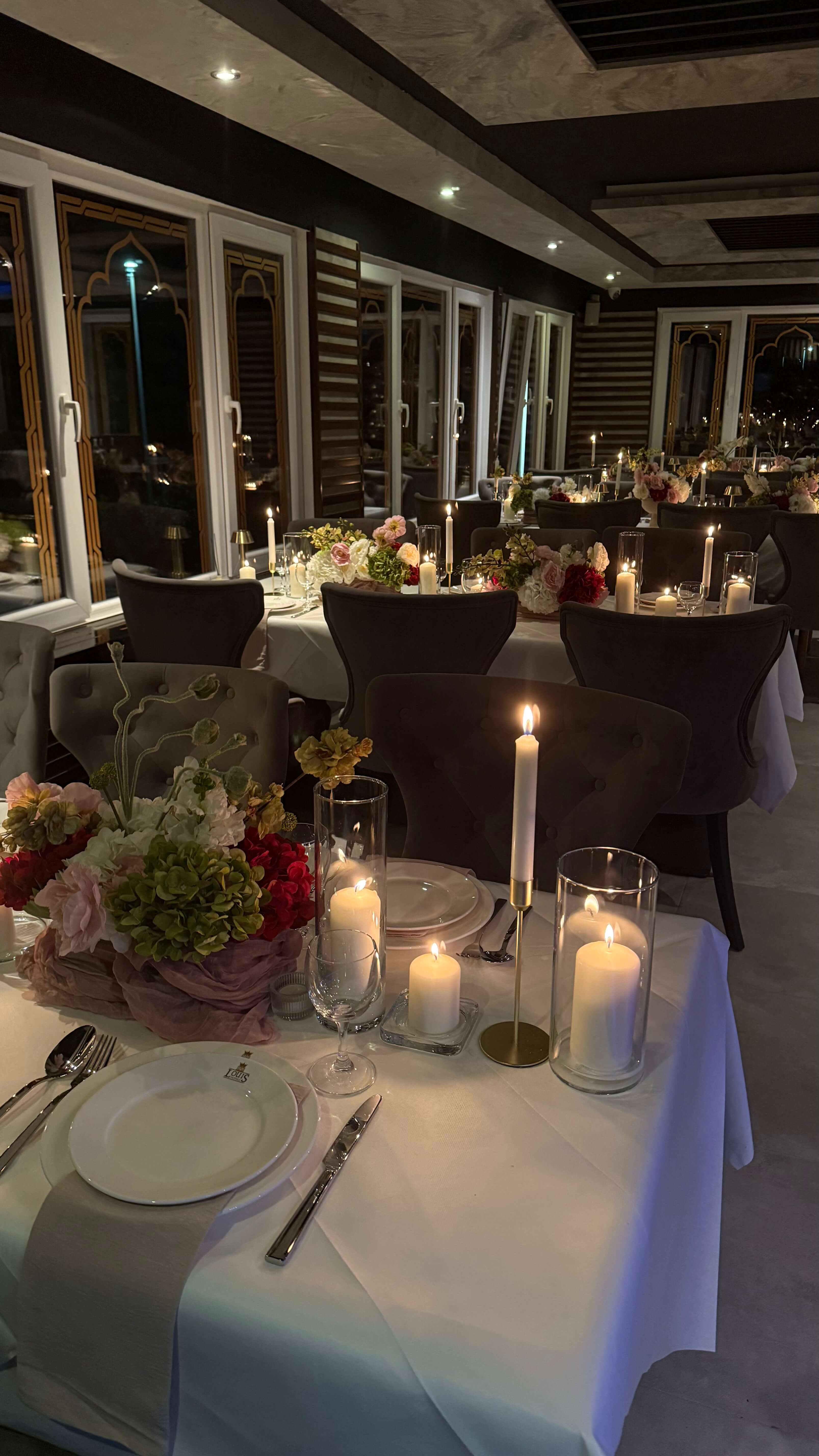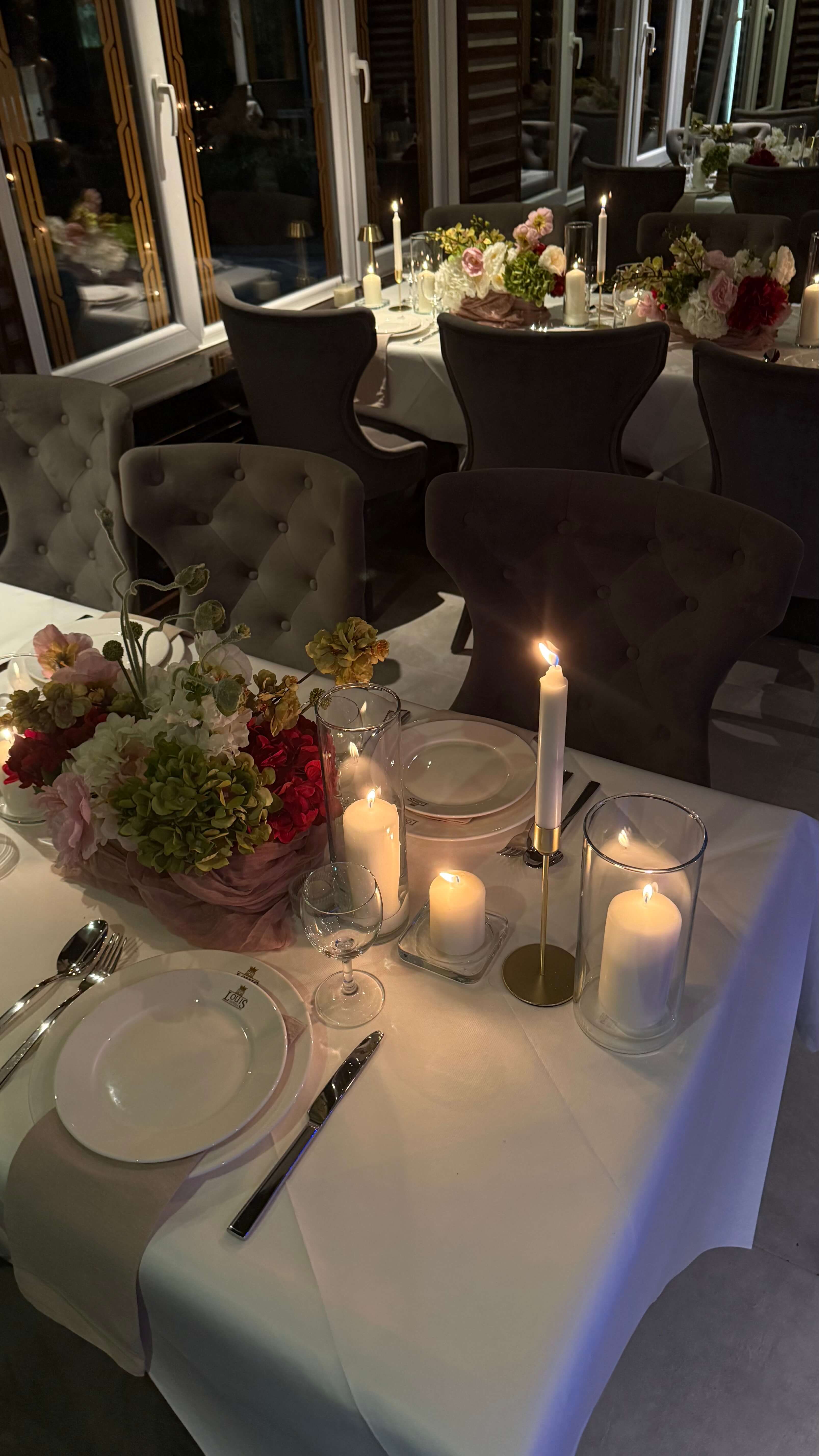 Der Abend beginnt mit Aperitifs bei Kerzenschein und sanfter Musik, während goldene Lichtreflexe auf edel gedeckten Tischen tanzen. Das Designkonzept kombiniert moderne Eleganz mit einer Prise Leichtigkeit: feine Stoffe, dezente Blumengestecke in warmen Tönen und sorgfältig platzierte Akzente aus Glas und Metall schaffen eine Atmosphäre, die gleichermaßen festlich wie einladend ist.